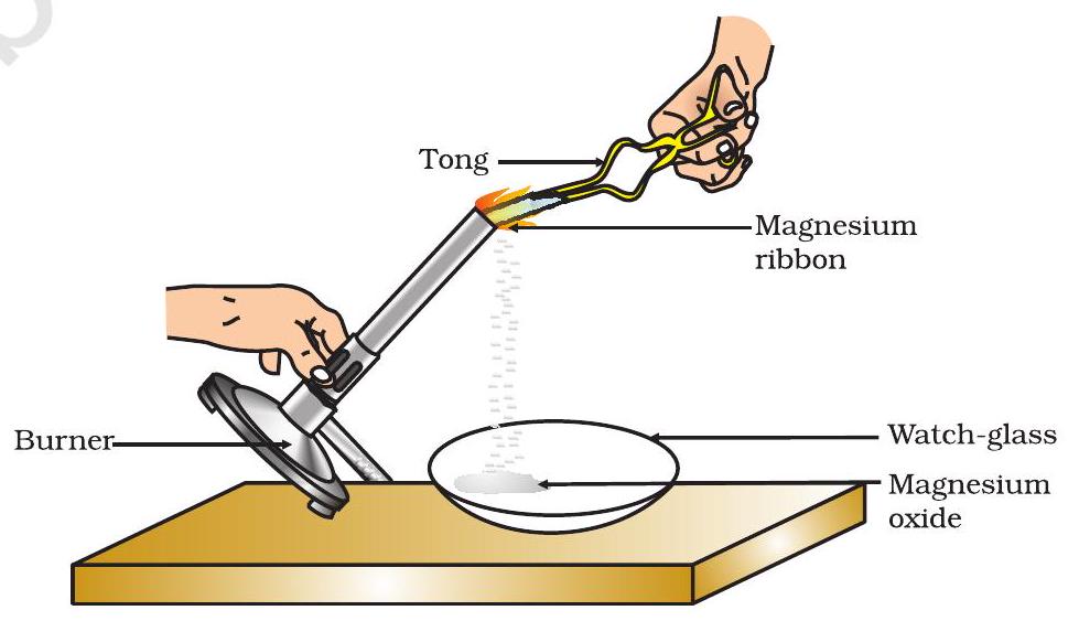 You must have observed that magnesium ribbon burns with a dazzling white flame and changes into a white powder. This powder is magnesium oxide. It is formed due to the reaction between magnesium and oxygen present in the air.