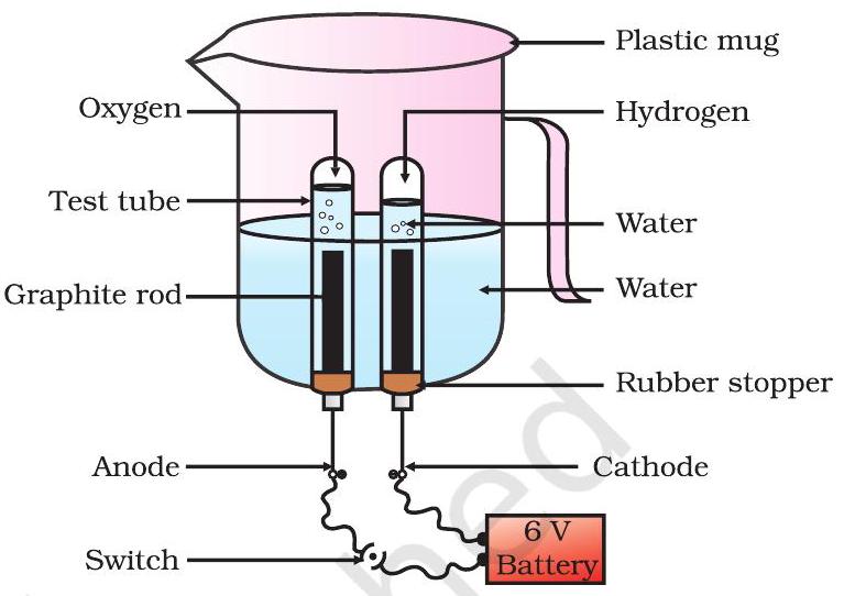 - You will observe the formation of bubbles at both the electrodes. These bubbles displace water in the test tubes.
