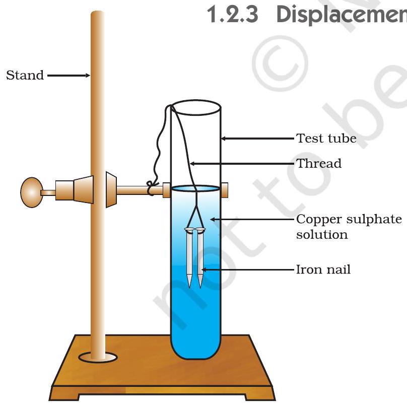 $\mathrm{Fe(s)}+\underset{\text{(Copper sulphate)}}{\mathrm{CuSO_4(aq)}} \rightarrow \underset{\text{Iron sulphate}}{\mathrm{FeSO_4(aq)}}+ \mathrm{Cu(s)} \quad (1.24)$