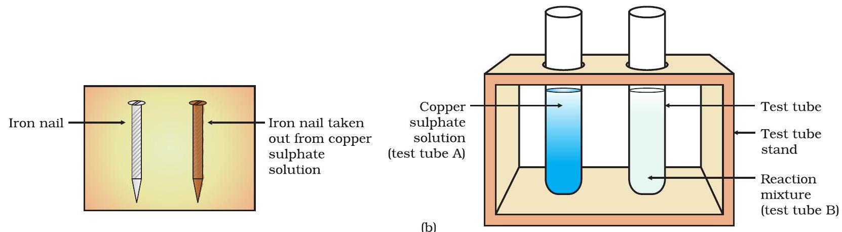 - Also, compare the colour of the iron nails dipped in the copper sulphate solution with the one kept aside [Fig. 1.8 (b)].