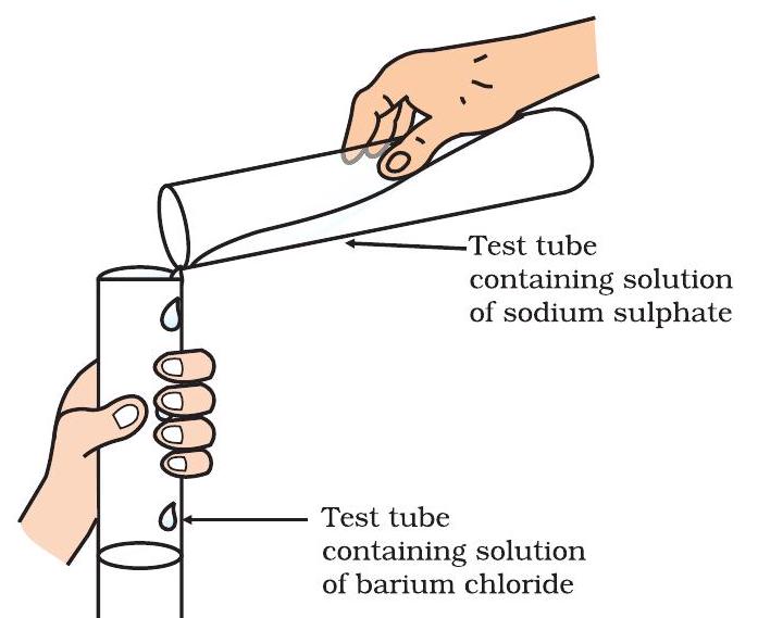 $ \underset{\text{(Sodium sulphate)}}{\mathrm{Na_2SO_4(aq)}}+\underset{\text{(Barium chloride)}}{\mathrm{BaCl_2(aq)}} \rightarrow \underset{\text{(Barium sulphate)}}{\mathrm{BaSO_4(s)}}+ \underset{\text{(Sodium chloride)}}{\mathrm{2NaCl(aq)}} \quad (1.27)$